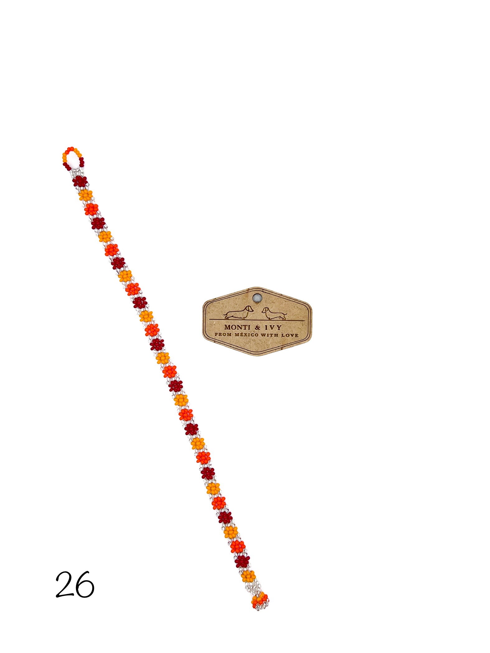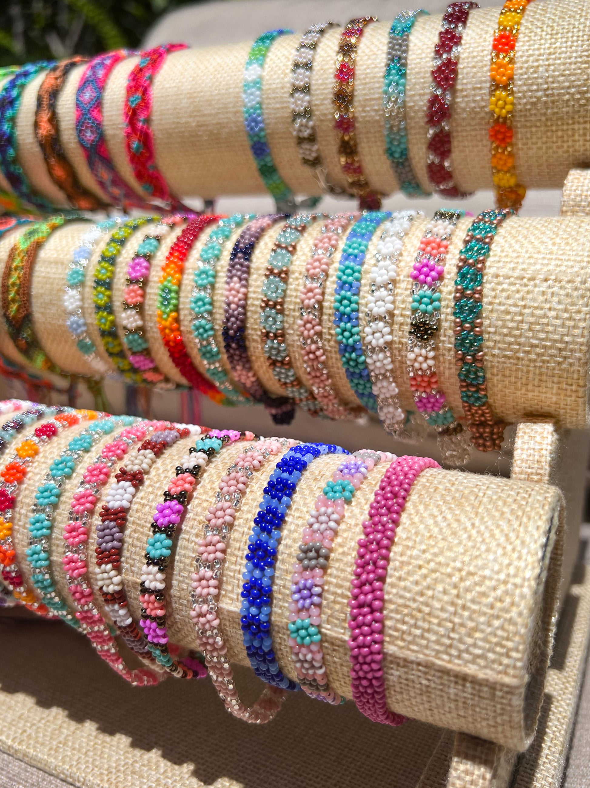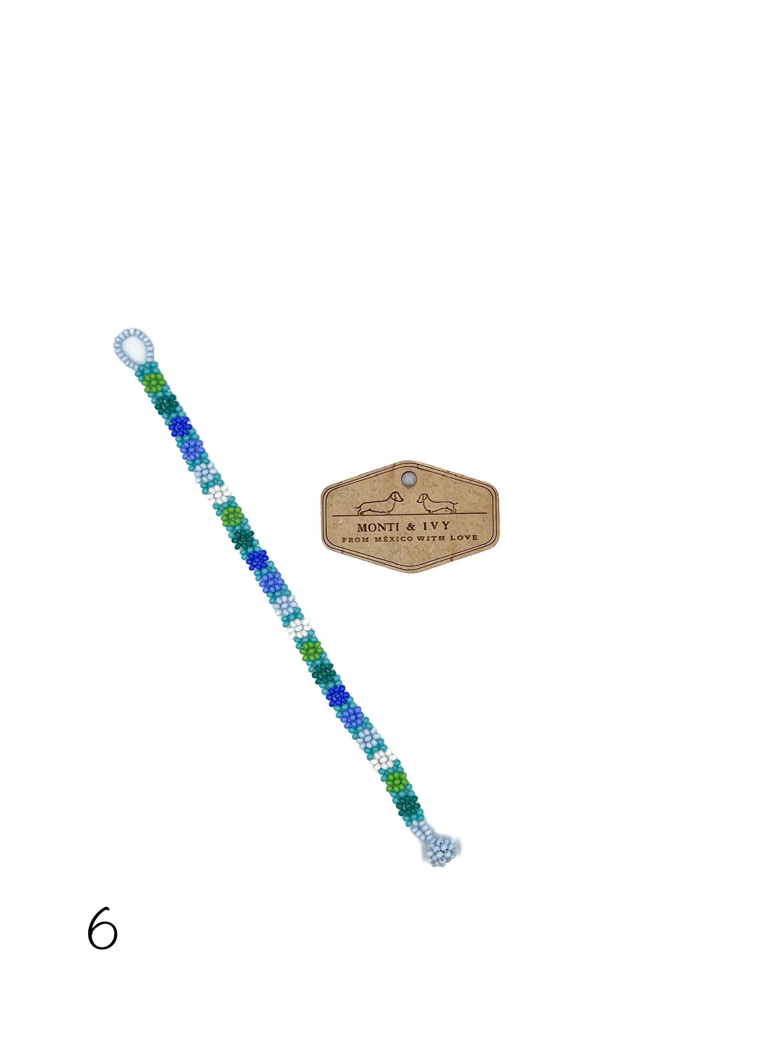 Diese feinen Armbänder werden von den Huichol aus Perlen gefertigt. Der Name der Perlen gibt auch diesem Armband seinen Namen "Chaquira"-Perlen. Dank der farbenfrohen Designs passen sie perfekt zu unseren Hundehalsbändern und -Leinen.