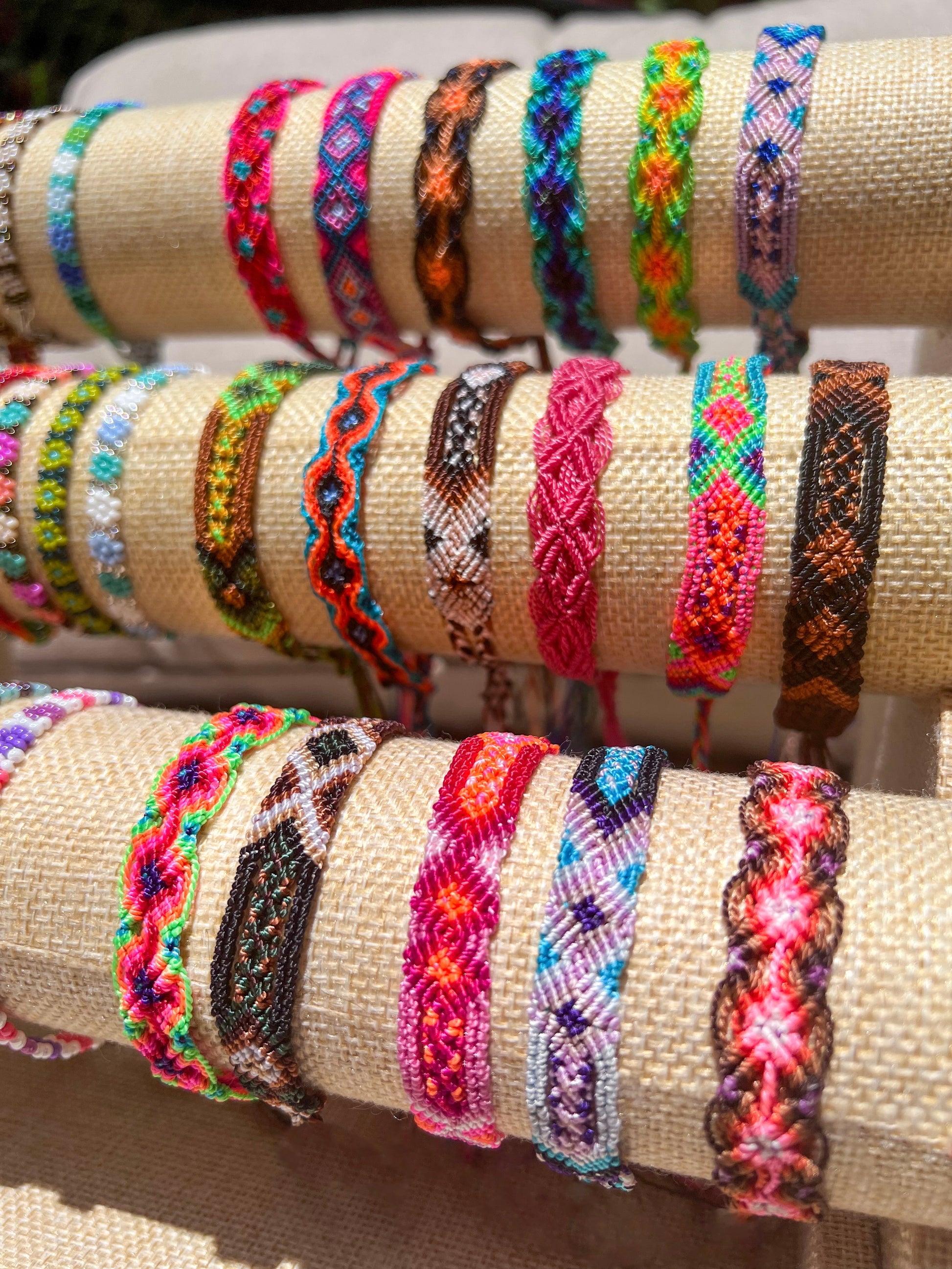 Diese farbenfrohen Armbänder aus Chiapas tragen ihre Herkunft im Namen. Wie auch unsere Hundehalsbänder und -Leinen sind sie aus Nylonfäden geknotet und mit einzigartigen Designs versehen. So passt ihr perfekt zu euren Hunden und könnt im Partnerlook auftreten.