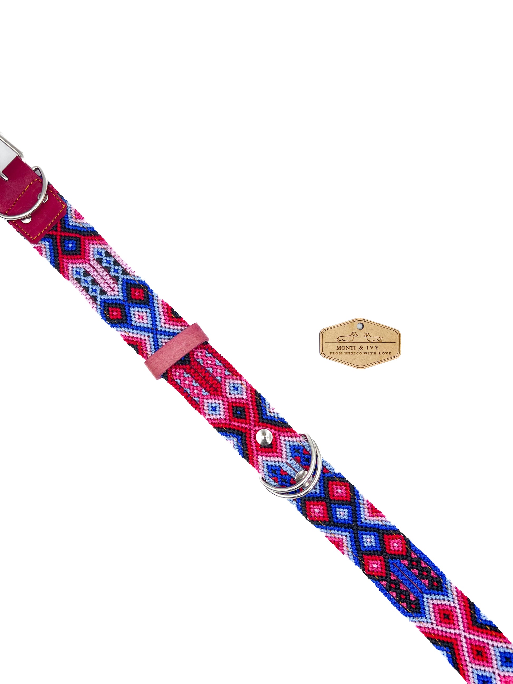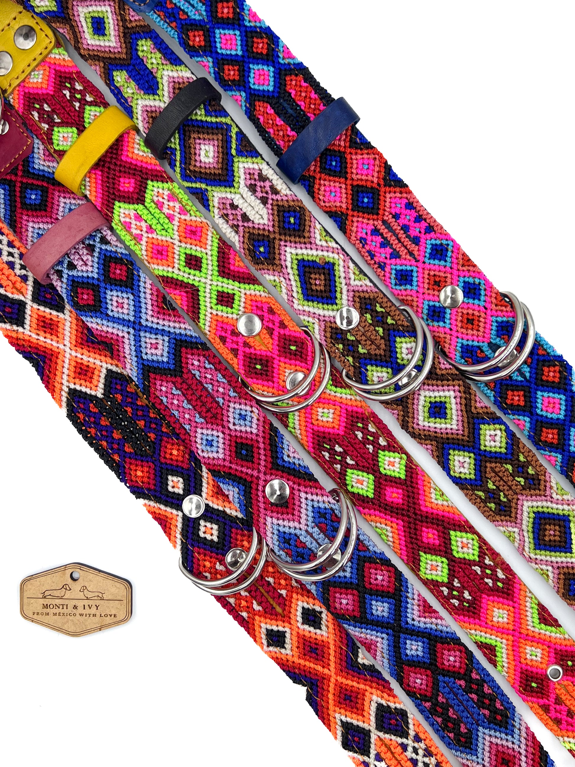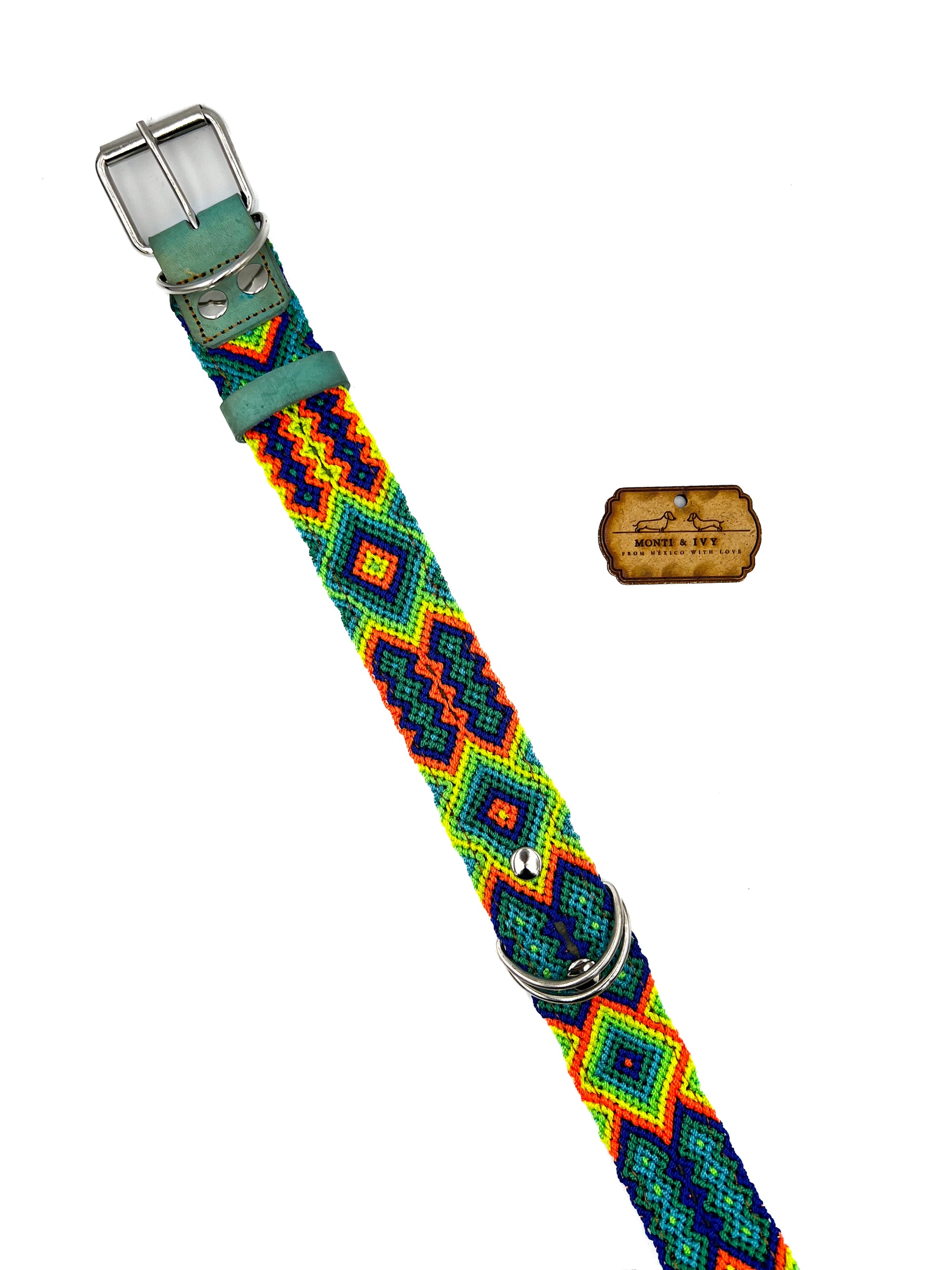 Wenn du ein echter Farbenliebhaber bist, wirst du diesen Stil lieben! Dieses Halsband ist wie ein Farbenparadies! Es fällt auf, egal wohin du gehst. Dieses Halsband ist mit einer Lederbasis verstärkt und darauf ist ein volles Wellenmuster gestickt, das von erstaunlichen mexikanischen Handwerkern hergestellt wurde. Jedes einzelne Design existiert nur einmal, ein zweites Mal findet man es nicht.