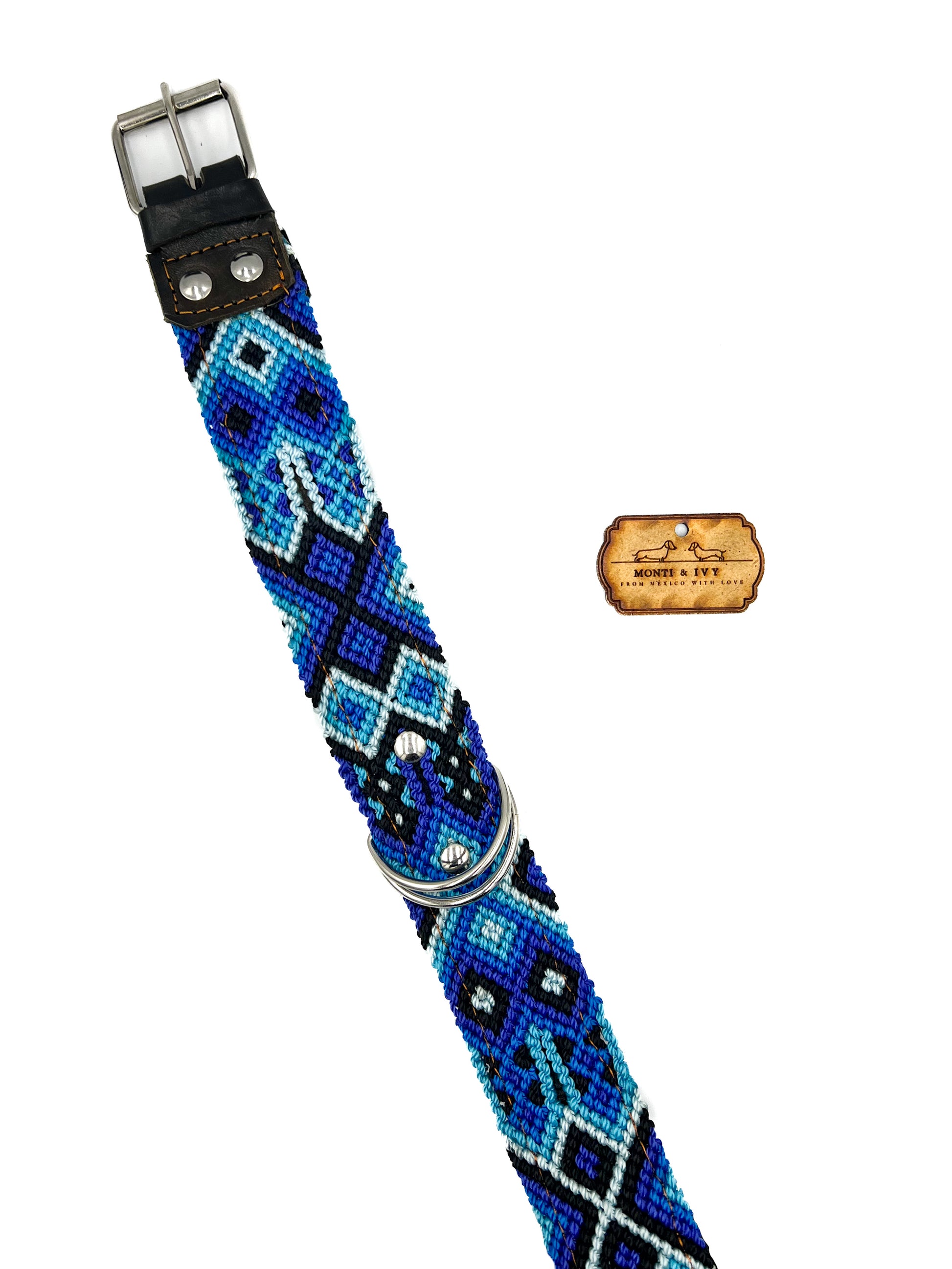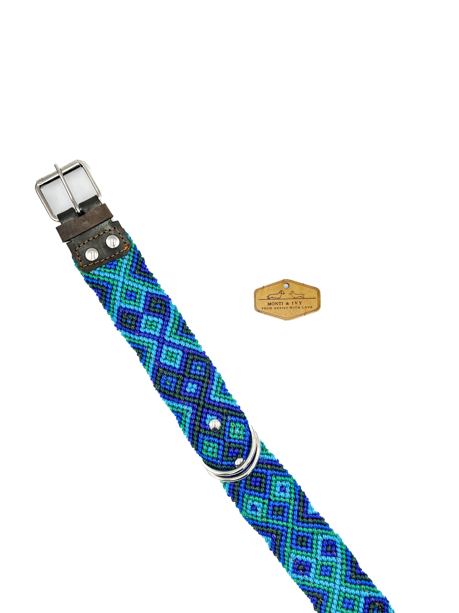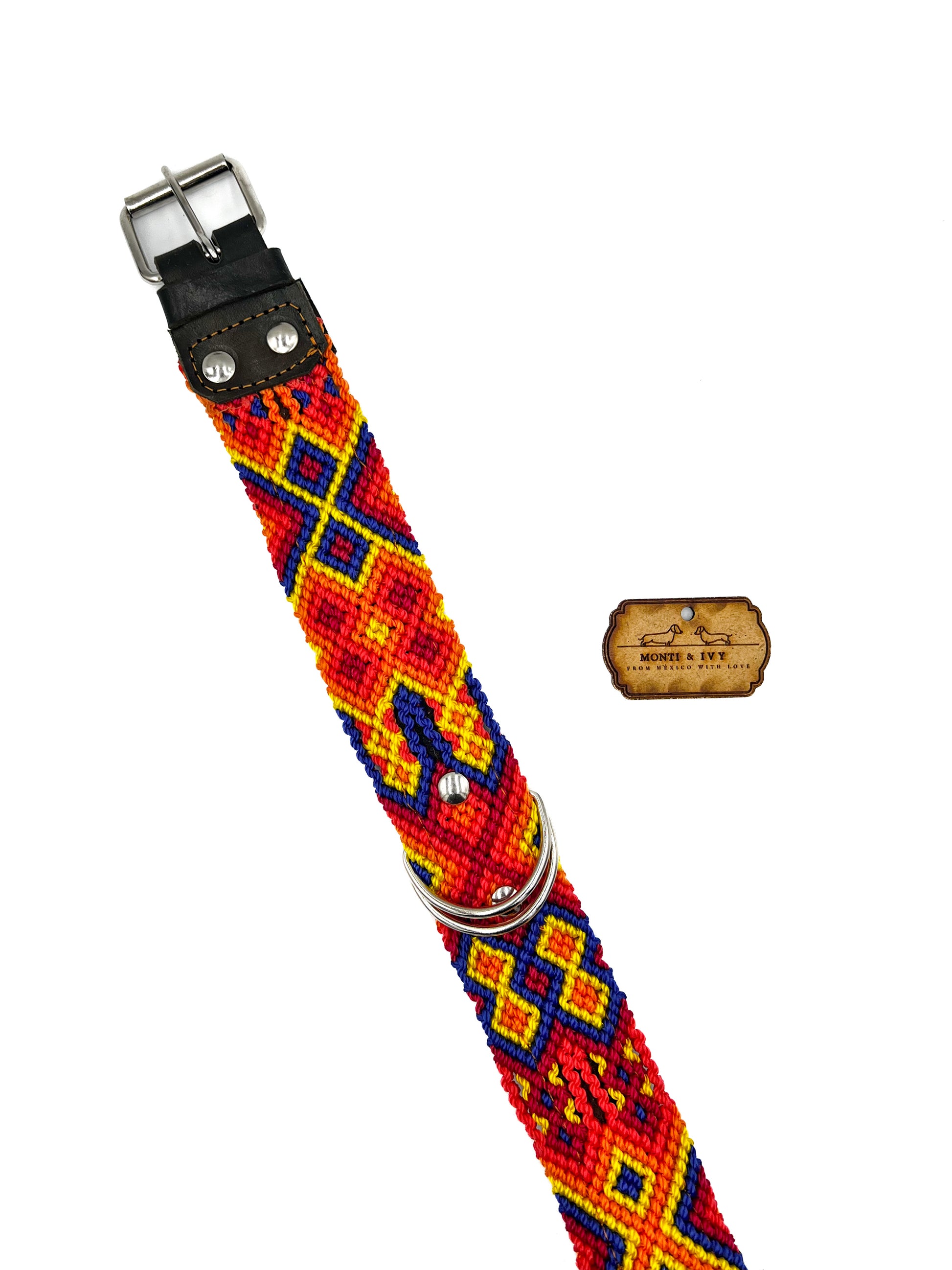 Dieses Halsband ist die perfekte Kombination zwischen unserer Halsband-Oase und unserem Paradies. Sie werden schöne gewebte Farbmuster finden, die mit Leder verstärkt sind. Das Leder am Boden und an der Vorderseite sorgt für Struktur und Festigkeit. Das volle Wellenmuster wird von erstaunlichen mexikanischen Handwerkern hergestellt. Jedes einzelne Design existiert nur einmal, ein zweites Mal findet man es nicht.