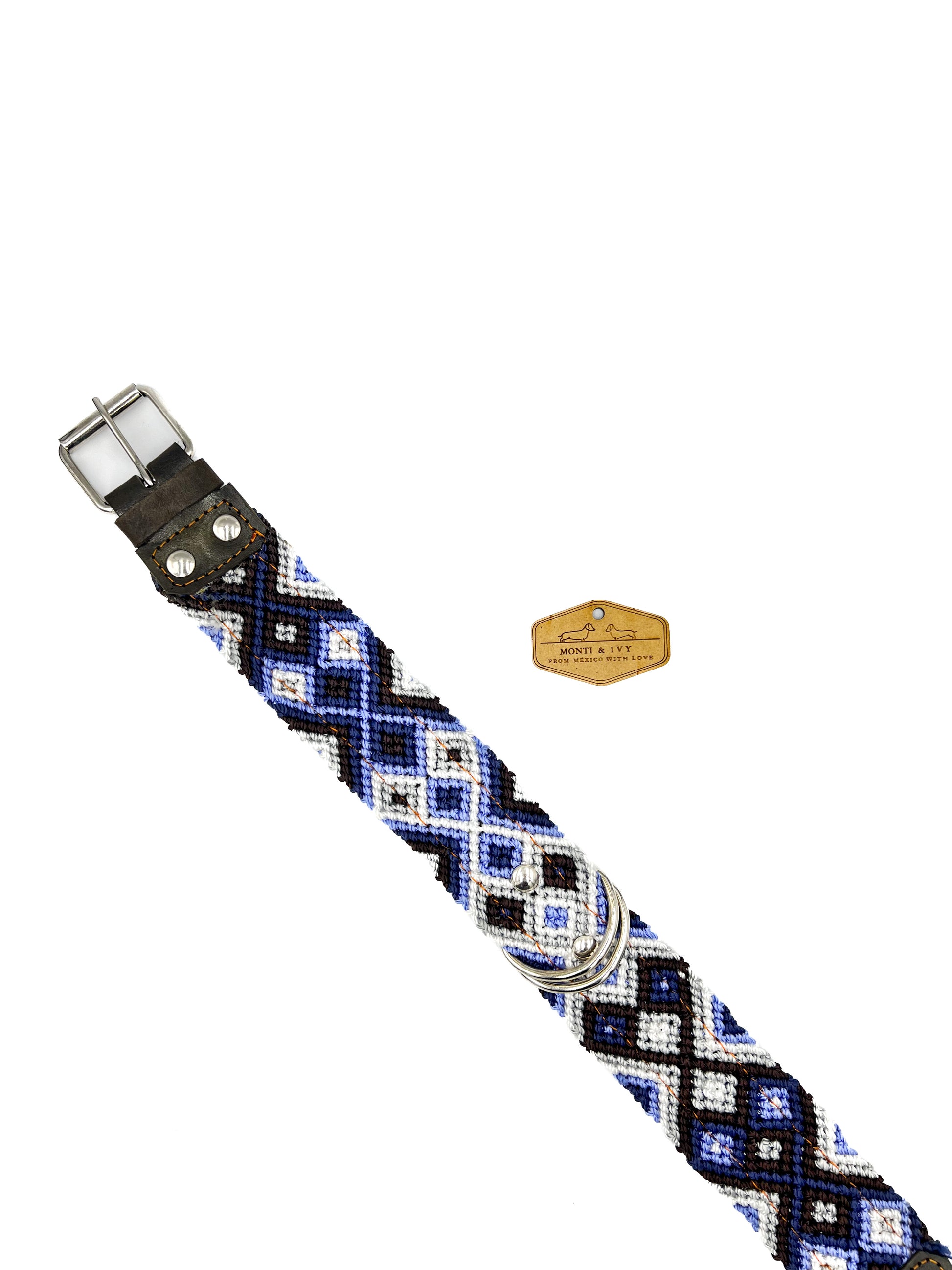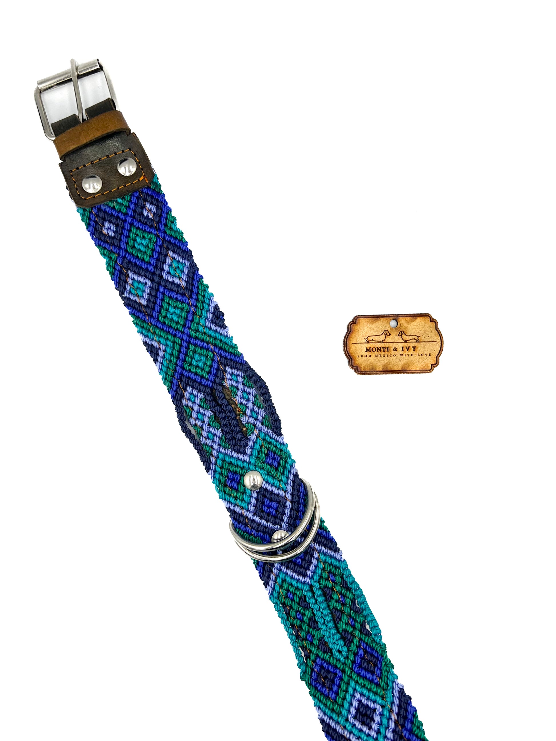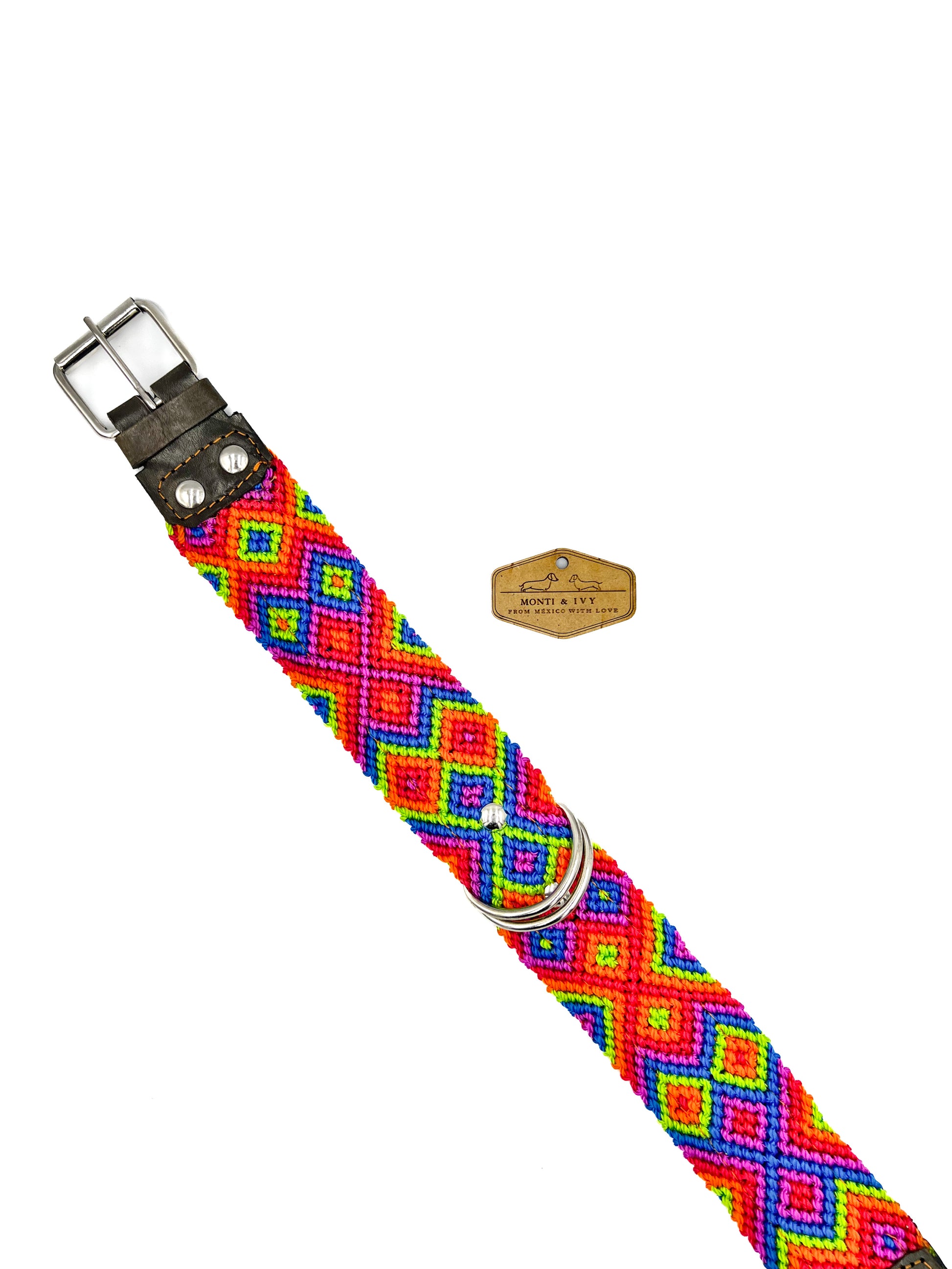 Dieses Halsband ist die perfekte Kombination zwischen unserer Halsband-Oase und unserem Paradies. Sie werden schöne gewebte Farbmuster finden, die mit Leder verstärkt sind. Das Leder am Boden und an der Vorderseite sorgt für Struktur und Festigkeit. Das volle Wellenmuster wird von erstaunlichen mexikanischen Handwerkern hergestellt. Jedes einzelne Design existiert nur einmal, ein zweites Mal findet man es nicht.