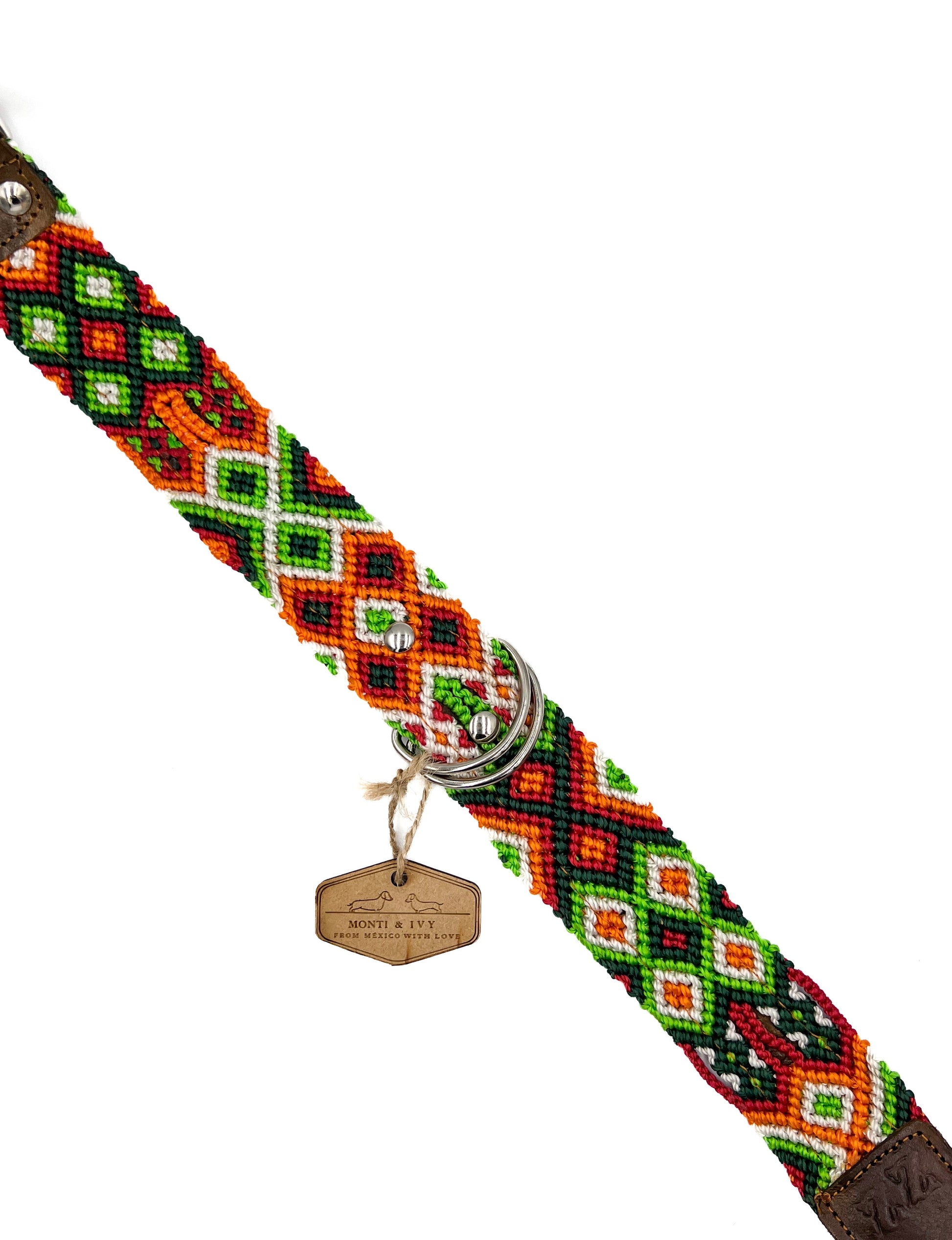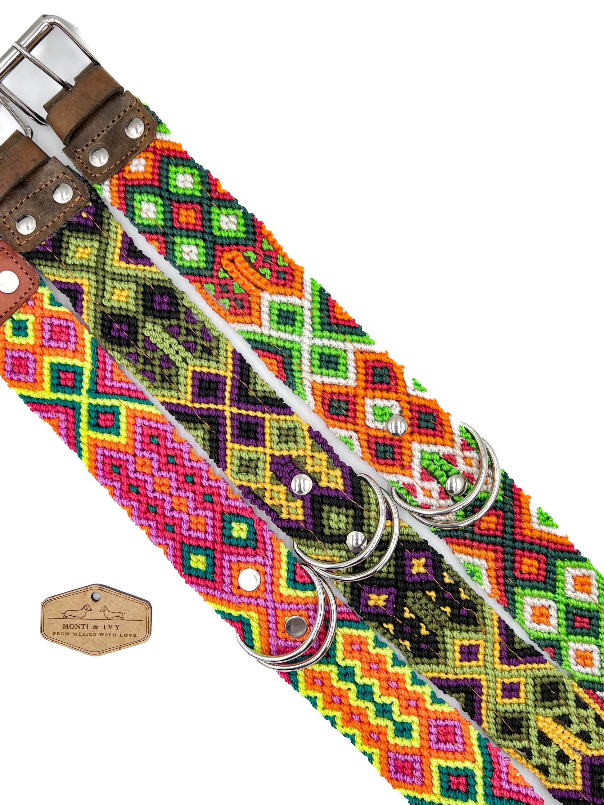 Dieses Halsband ist die perfekte Kombination zwischen unserer Halsband-Oase und unserem Paradies. Sie werden schöne gewebte Farbmuster finden, die mit Leder verstärkt sind. Das Leder am Boden und an der Vorderseite sorgt für Struktur und Festigkeit. Das volle Wellenmuster wird von erstaunlichen mexikanischen Handwerkern hergestellt. Jedes einzelne Design existiert nur einmal, ein zweites Mal findet man es nicht.
