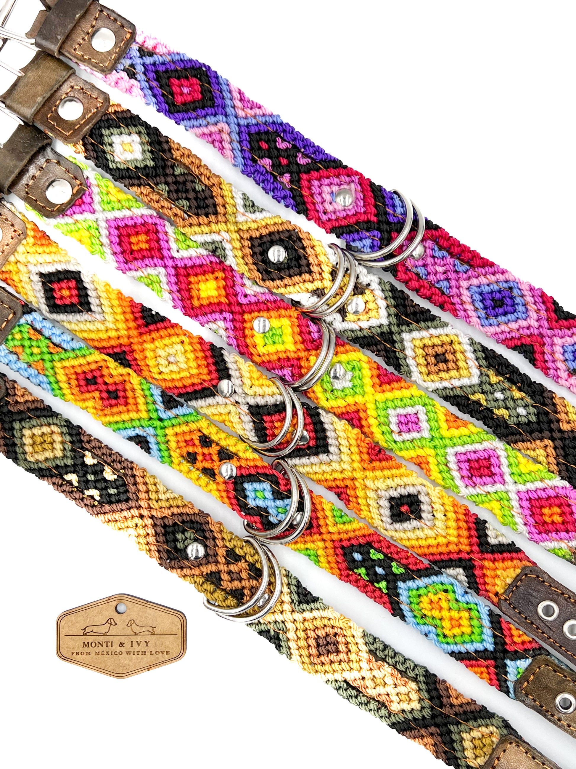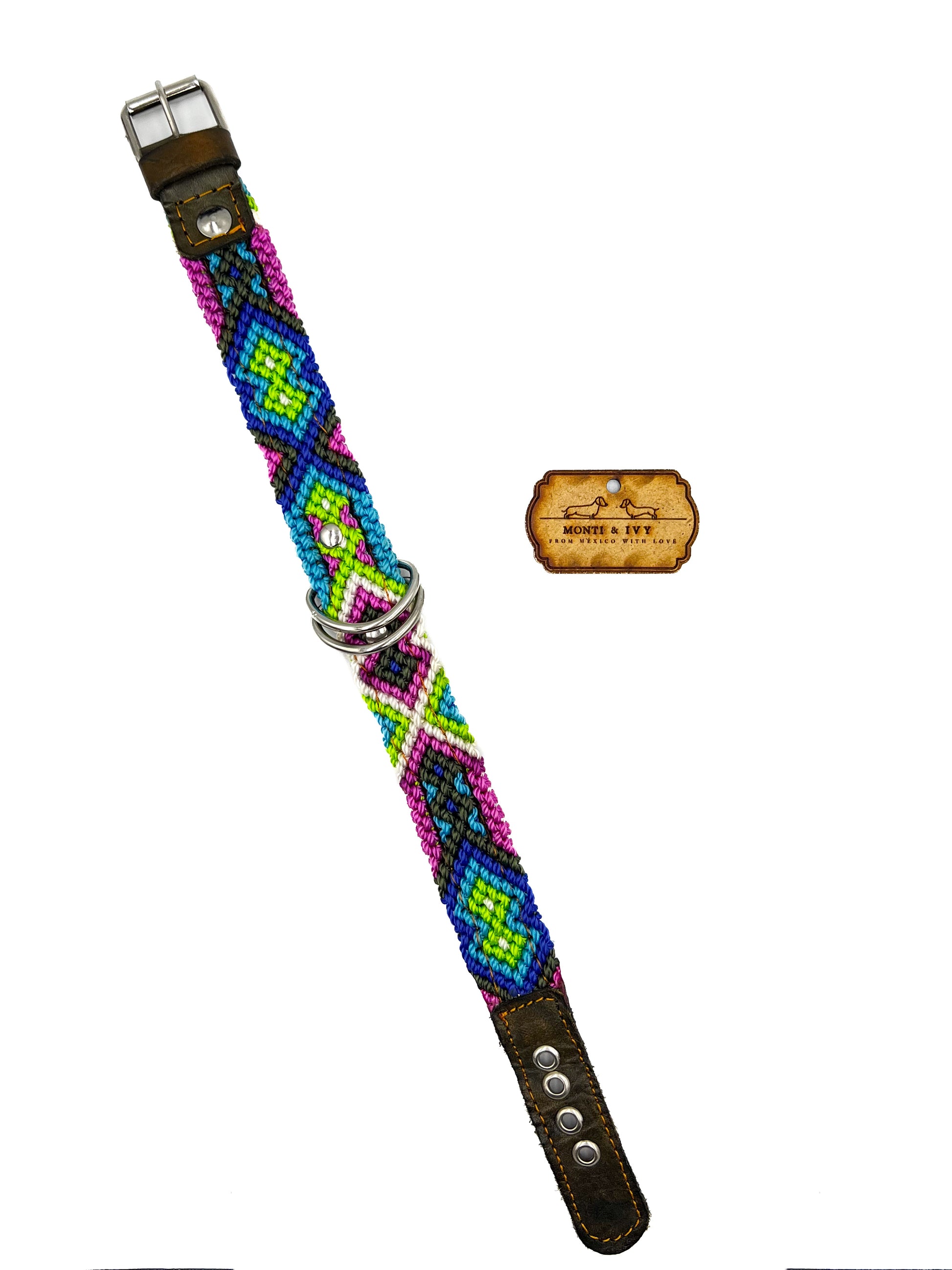 Dieses Halsband ist die perfekte Kombination zwischen unserer Halsband-Oase und unserem Paradies. Sie werden schöne gewebte Farbmuster finden, die mit Leder verstärkt sind. Das Leder am Boden und an der Vorderseite sorgt für Struktur und Festigkeit. Das volle Wellenmuster wird von erstaunlichen mexikanischen Handwerkern hergestellt. Jedes einzelne Design existiert nur einmal, ein zweites Mal findet man es nicht.