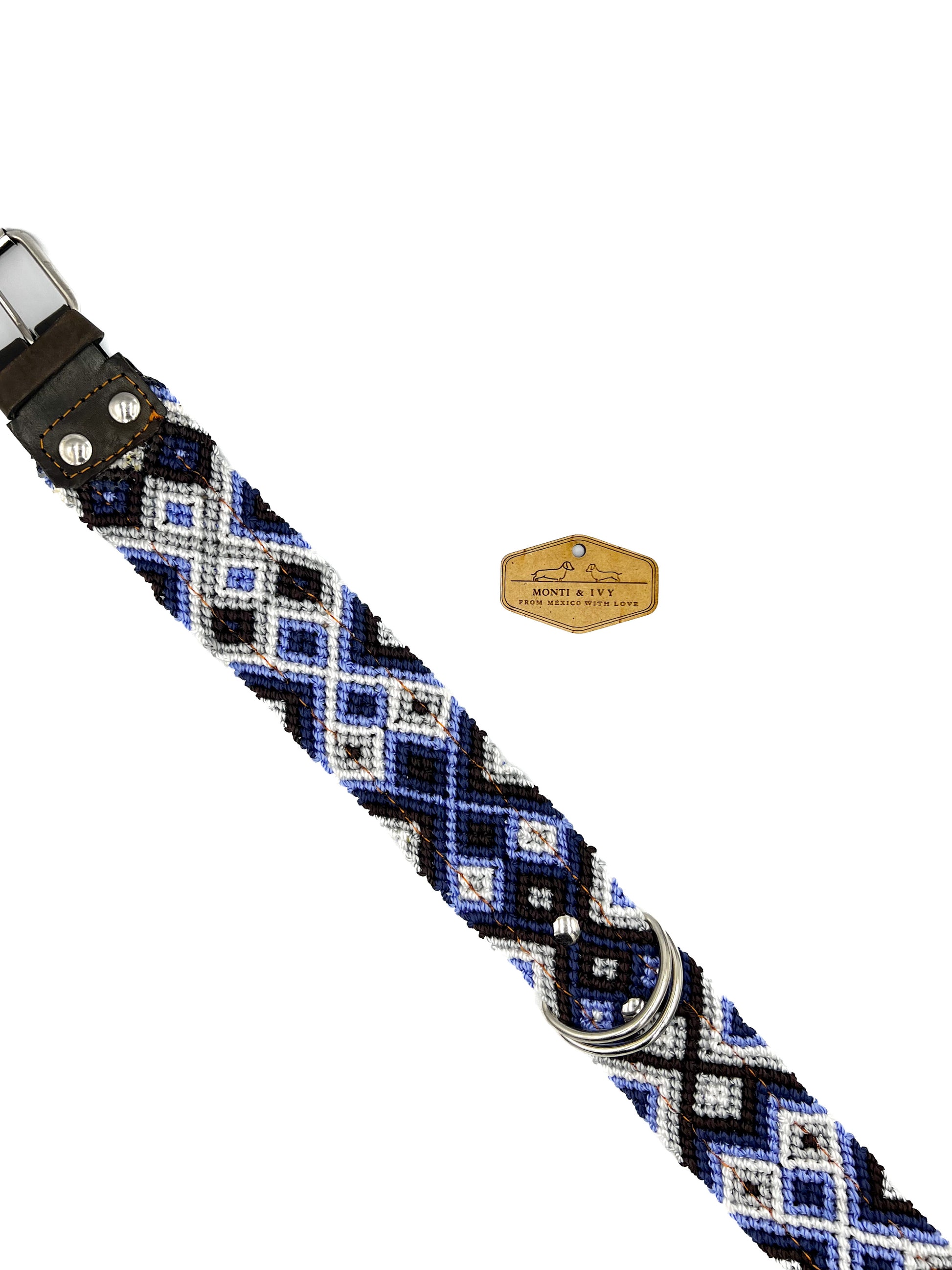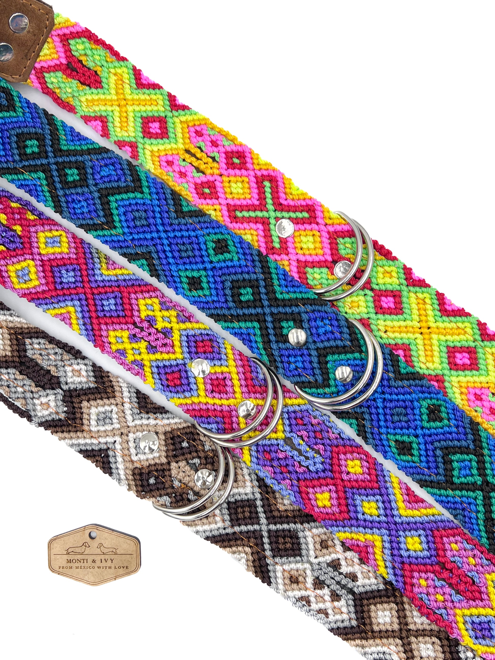 Dieses Halsband ist die perfekte Kombination zwischen unserer Halsband-Oase und unserem Paradies. Sie werden schöne gewebte Farbmuster finden, die mit Leder verstärkt sind. Das Leder am Boden und an der Vorderseite sorgt für Struktur und Festigkeit. Das volle Wellenmuster wird von erstaunlichen mexikanischen Handwerkern hergestellt. Jedes einzelne Design existiert nur einmal, ein zweites Mal findet man es nicht.