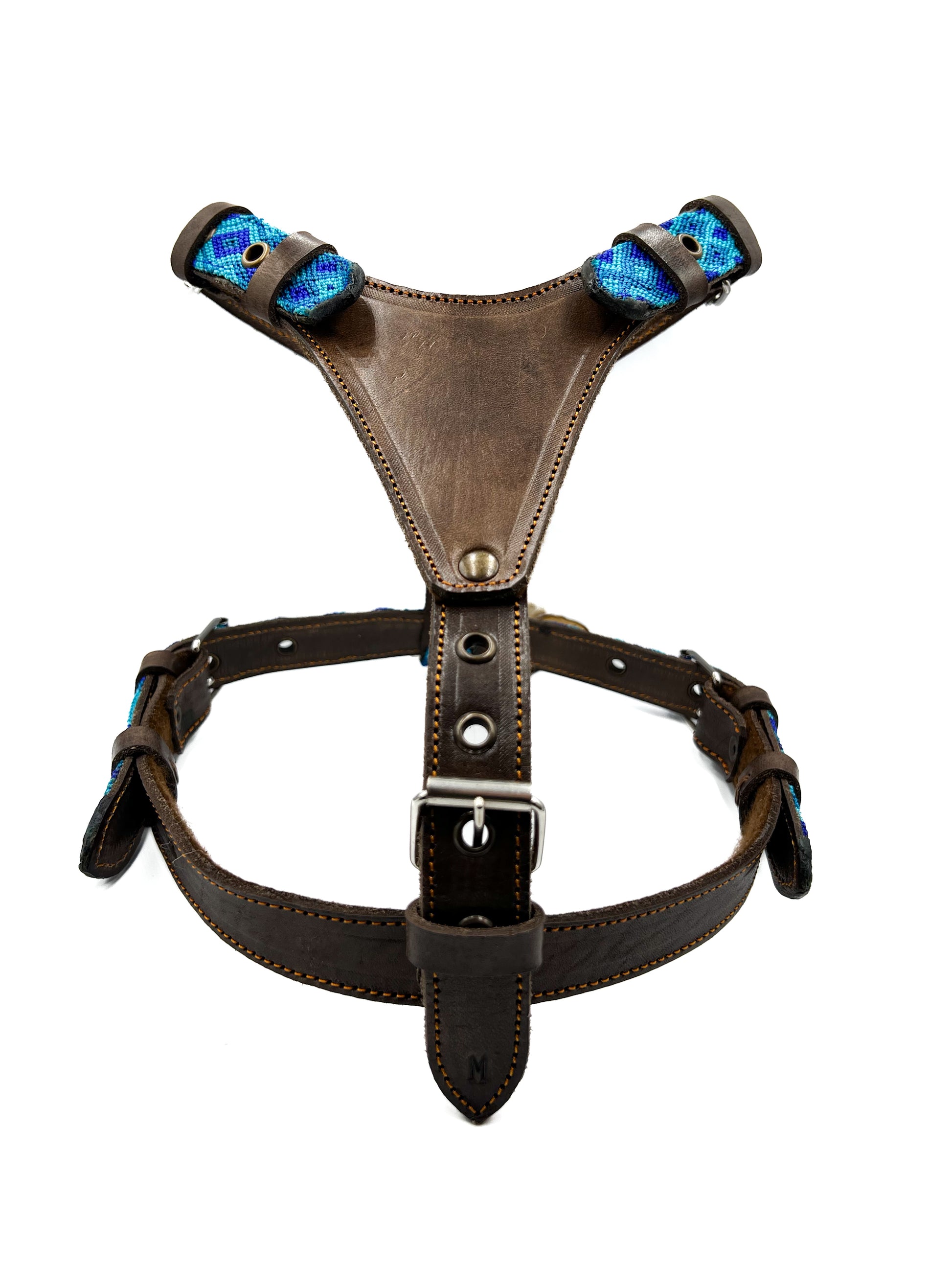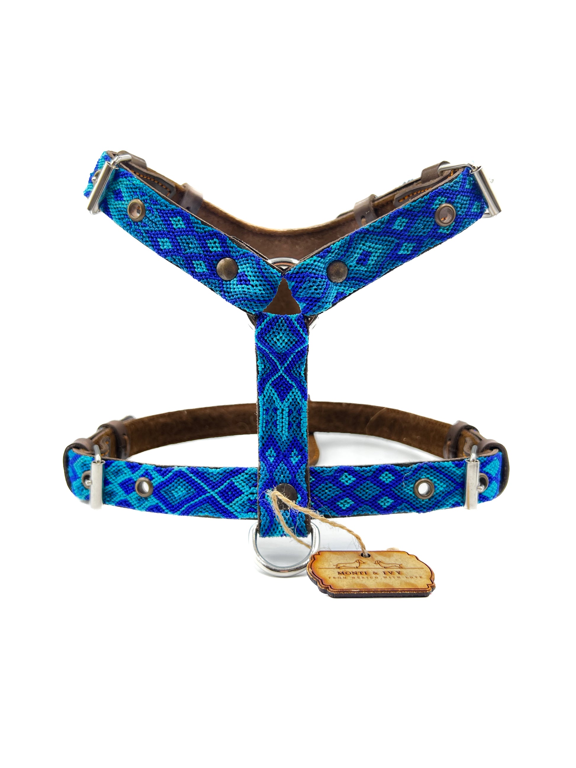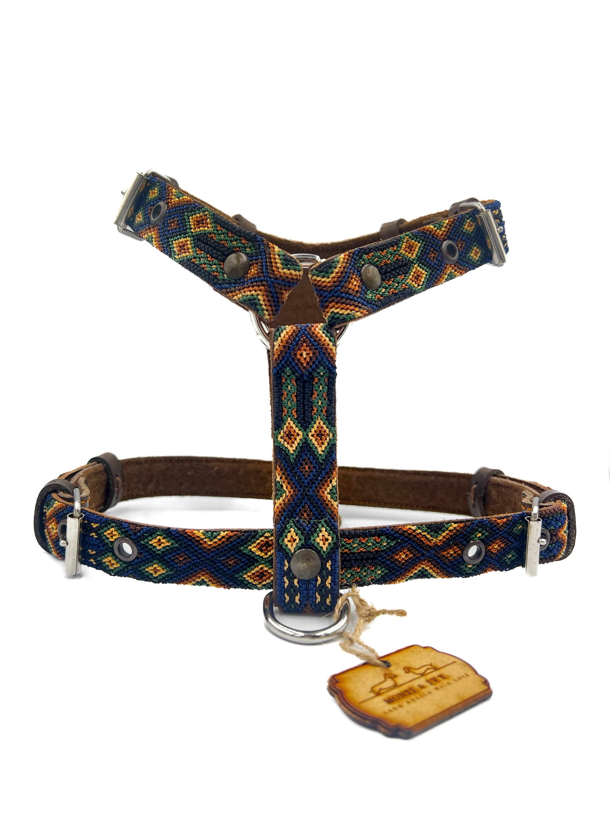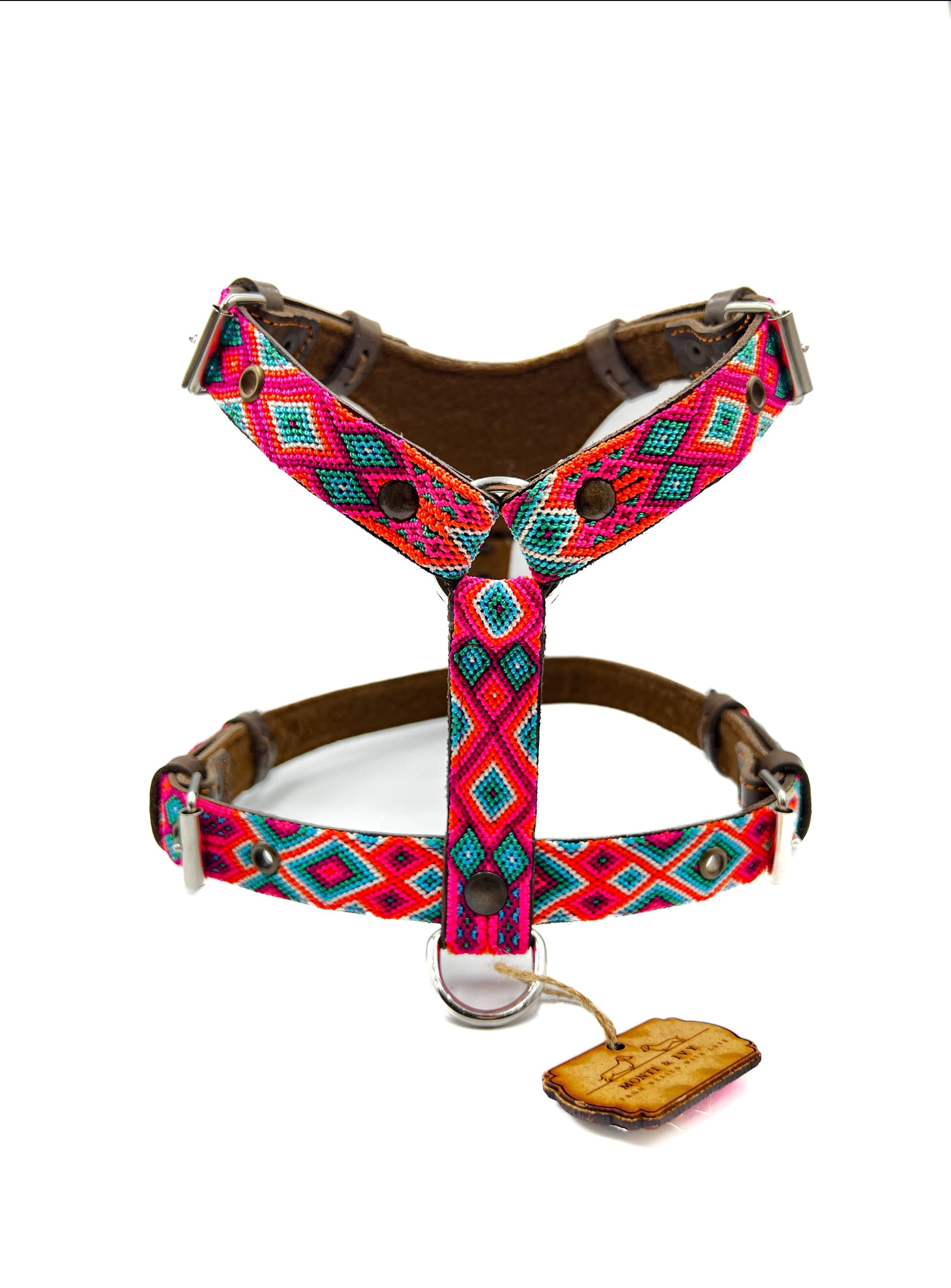 Unsere Geschirre sind die perfekte Wahl für alle, die mehr Kontrolle haben wollen, während sie ihre Hunde ausführen. Sie sind aus mexikanischem Leder gefertigt und mit einem weichen Stoff innen verkleidet für mehr Komfort. Auf der Oberseite sind sie mit einem wunderschönen handgewebten Muster in einzigartigen Farben und Designs verziert.