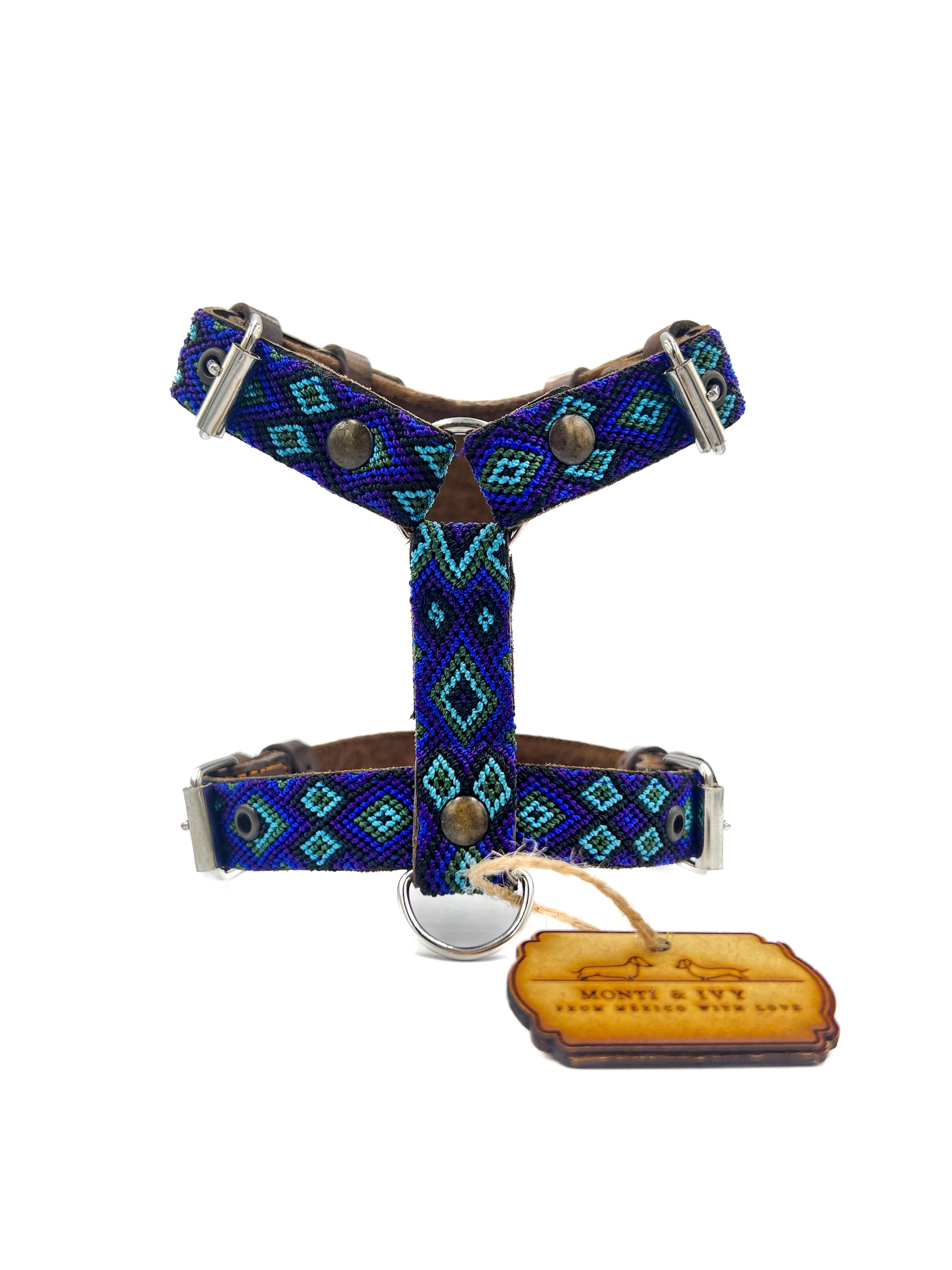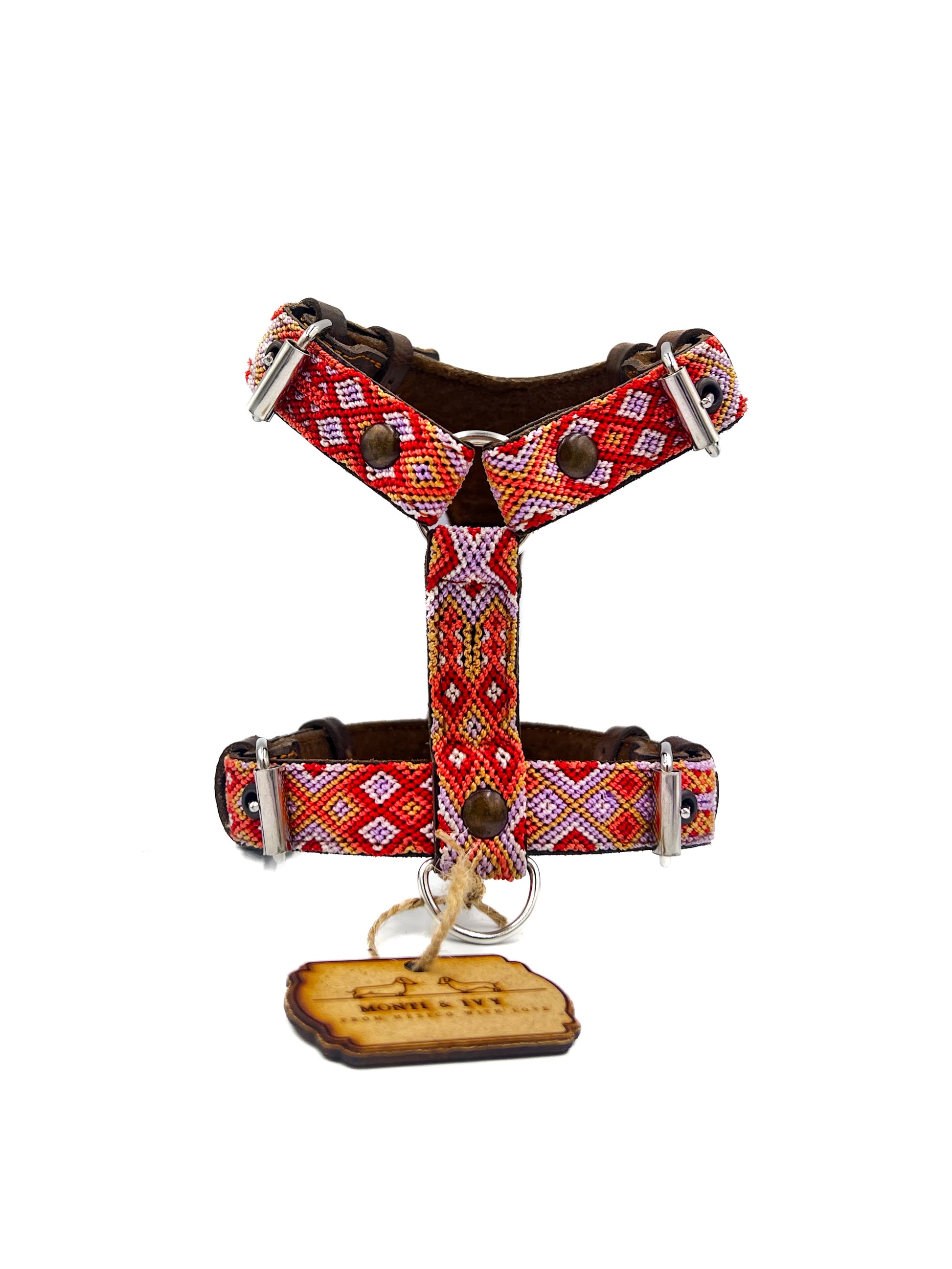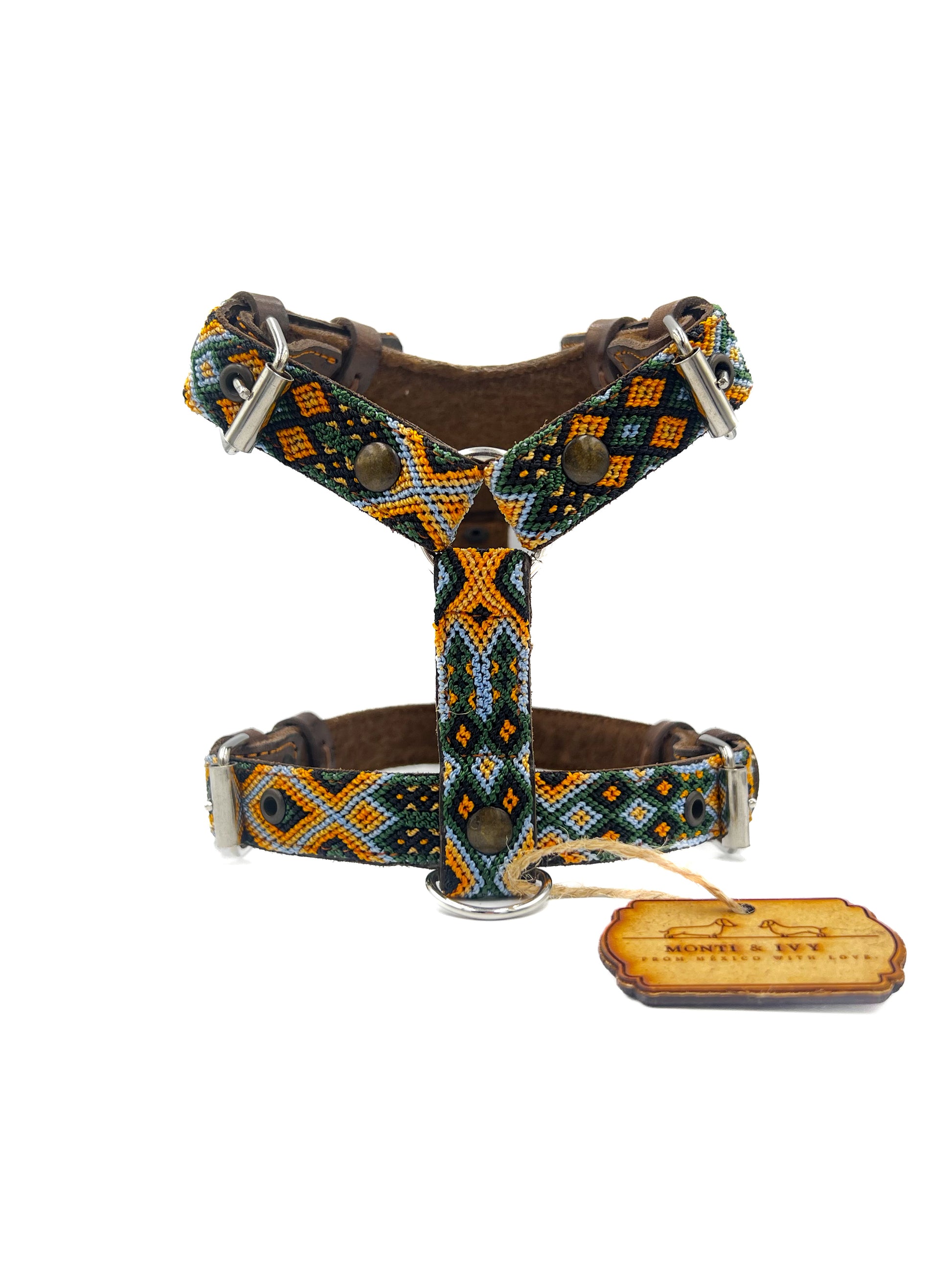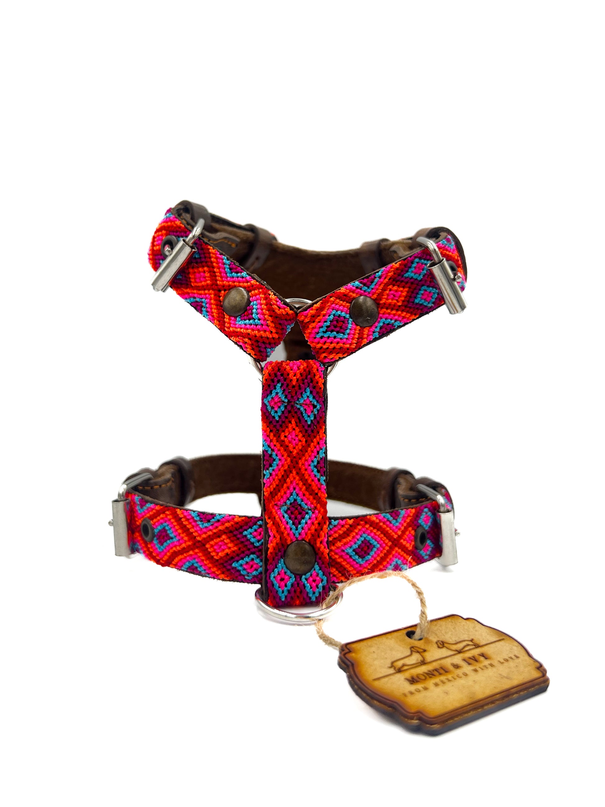 Unsere Geschirre sind die perfekte Wahl für alle, die mehr Kontrolle haben wollen, während sie ihre Hunde ausführen. Sie sind aus mexikanischem Leder gefertigt und mit einem weichen Stoff innen verkleidet für mehr Komfort. Auf der Oberseite sind sie mit einem wunderschönen handgewebten Muster in einzigartigen Farben und Designs verziert.
